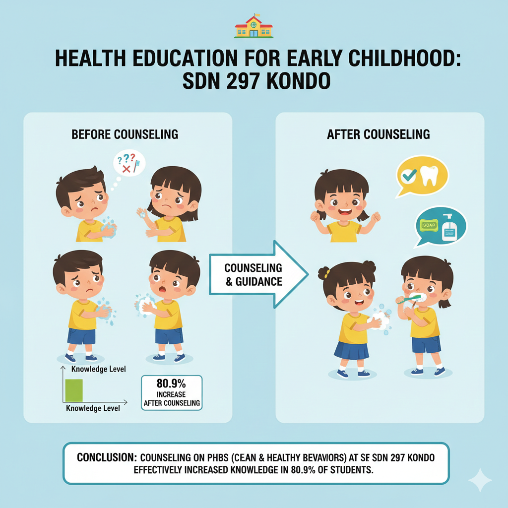 Penerapan Perilaku Hidup Bersih dan Sehat (PHBS) merupakan kebutuhan mutlak bagi anak usia sekolah (6-12 tahun) untuk mencegah penyakit seperti diare dan gigi berlubang. Kegiatan pengabdian masyarakat ini bertujuan untuk meningkatkan pemahaman siswa di SDN 297 Kondo mengenai pentingnya cara mencuci tangan yang benar serta cara menyikat gigi yang baik dan benar. Metode yang digunakan meliputi penyuluhan (ceramah bervariasi), pembimbingan (demonstrasi), dan pendampingan (latihan). Evaluasi dilakukan dengan membandingkan hasil pre-test dan post-test. Hasil kegiatan menunjukkan peningkatan pengetahuan yang signifikan, di mana 17 dari 21 siswa (80,9%) mengalami kenaikan pemahaman mengenai PHBS setelah diberikan intervensi. Hal ini menunjukkan bahwa edukasi kesehatan efektif dalam meningkatkan kesadaran hidup bersih pada siswa sekolah dasar.